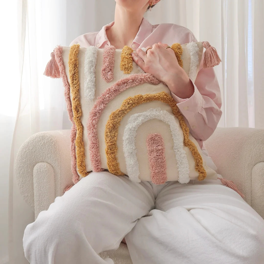 De prachtige getufte patronen en decoratieve kwastjes geven direct warmte, textuur en karakter aan elke ruimte. Perfect voor op de bank, stoel of het bed.