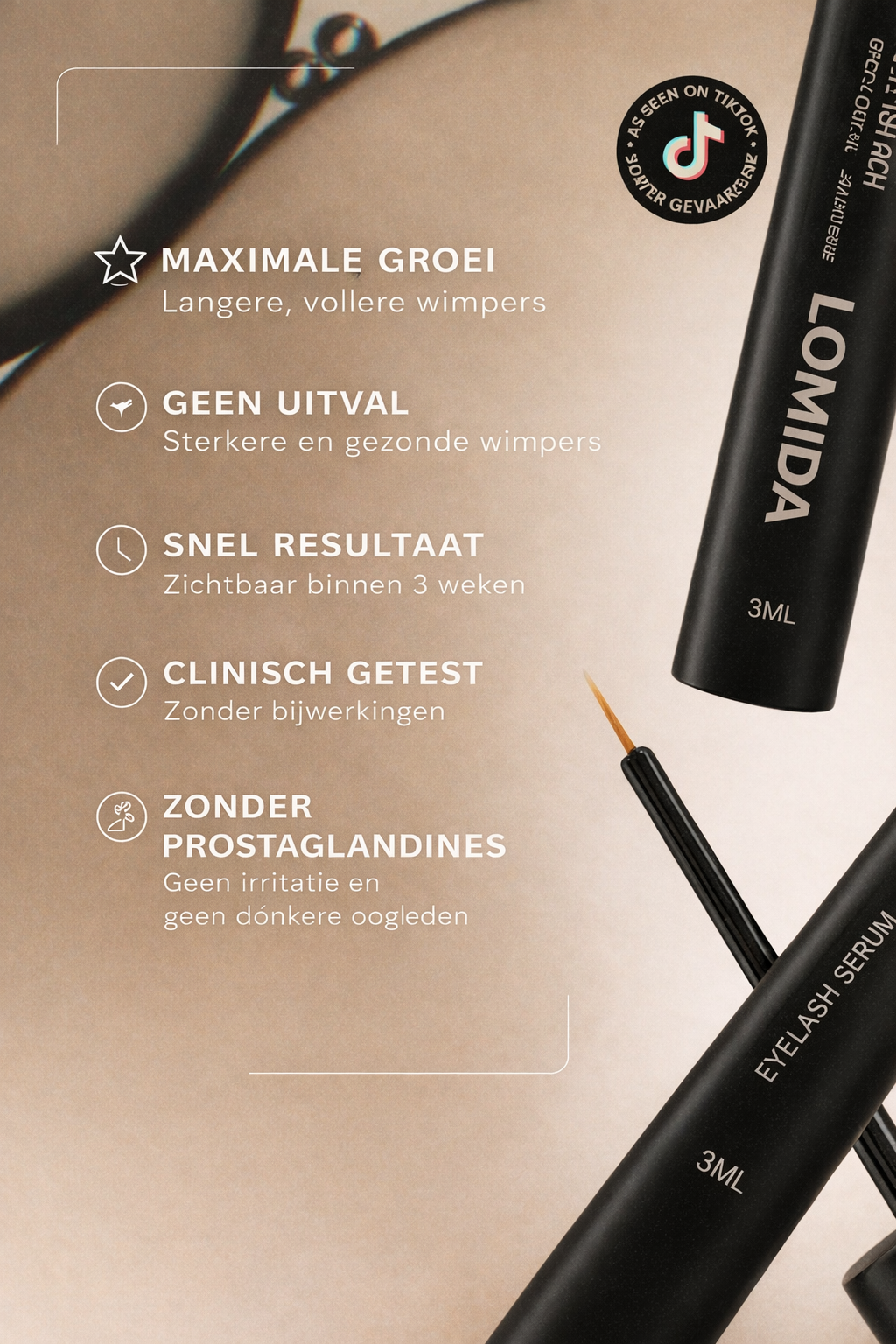 • Werking: Stimuleert groei, versterkt wimperfollikels, vermindert uitval, verbetert dichtheid en dikte